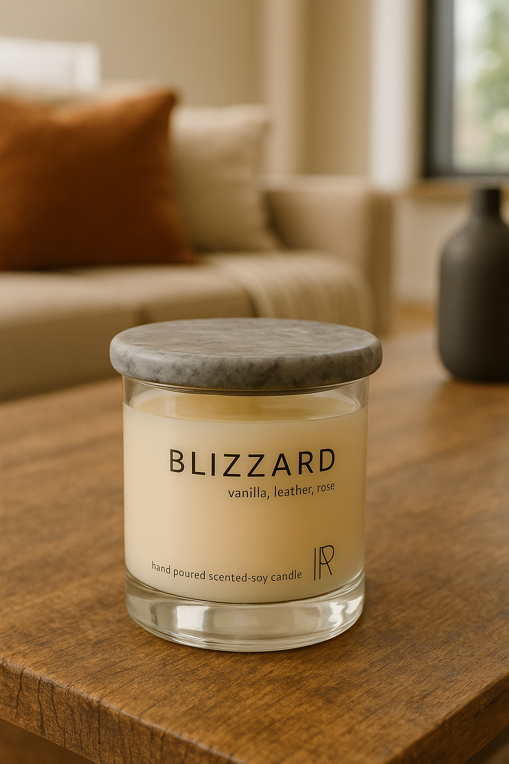 Blizzard is a hand-poured soy candle blending warm vanilla, soft leather, and delicate rose — a unique trio that evokes a sense of refined coziness.